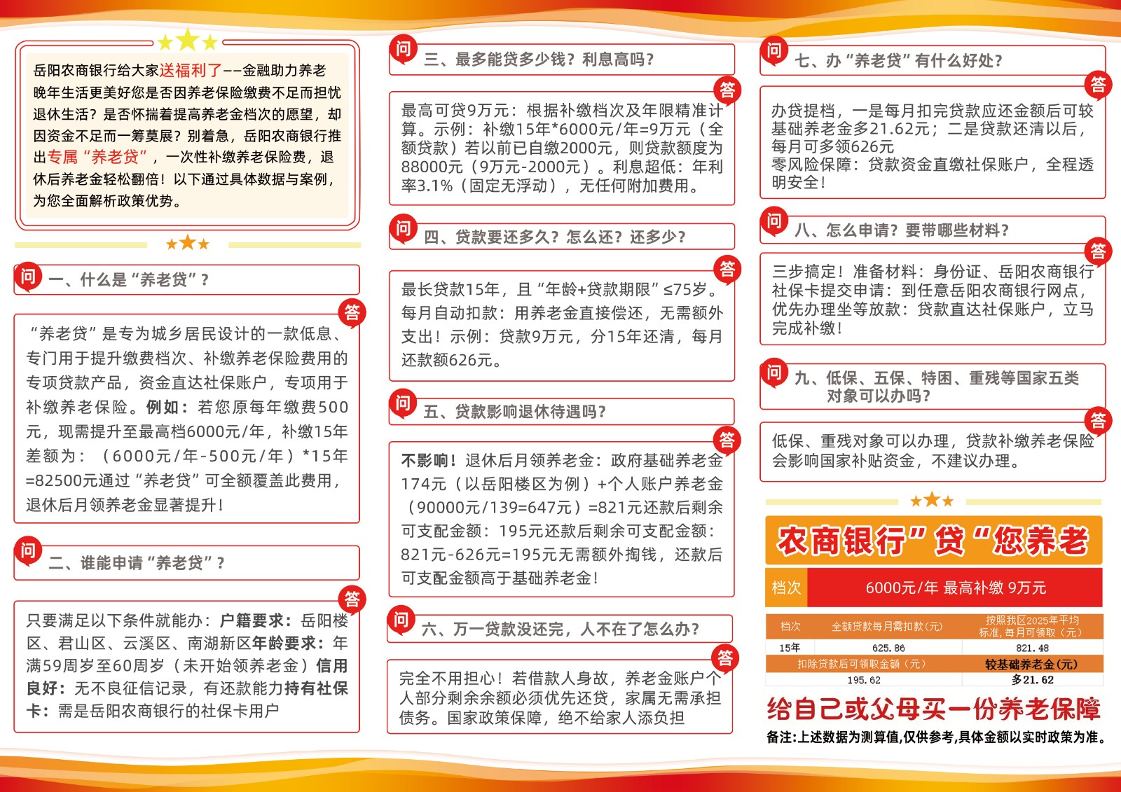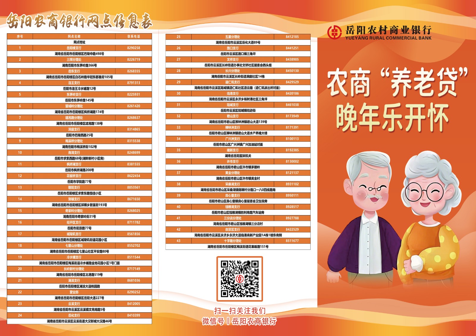 为解决居民提高养老保险缴费档次而资金不足的问题,切实提升城乡居民养老保险待遇水平,近期,人社部门和岳阳市农商银行已合作推出“养老贷”业务,有需要的居民,可就近到如图银行网点咨询办理。